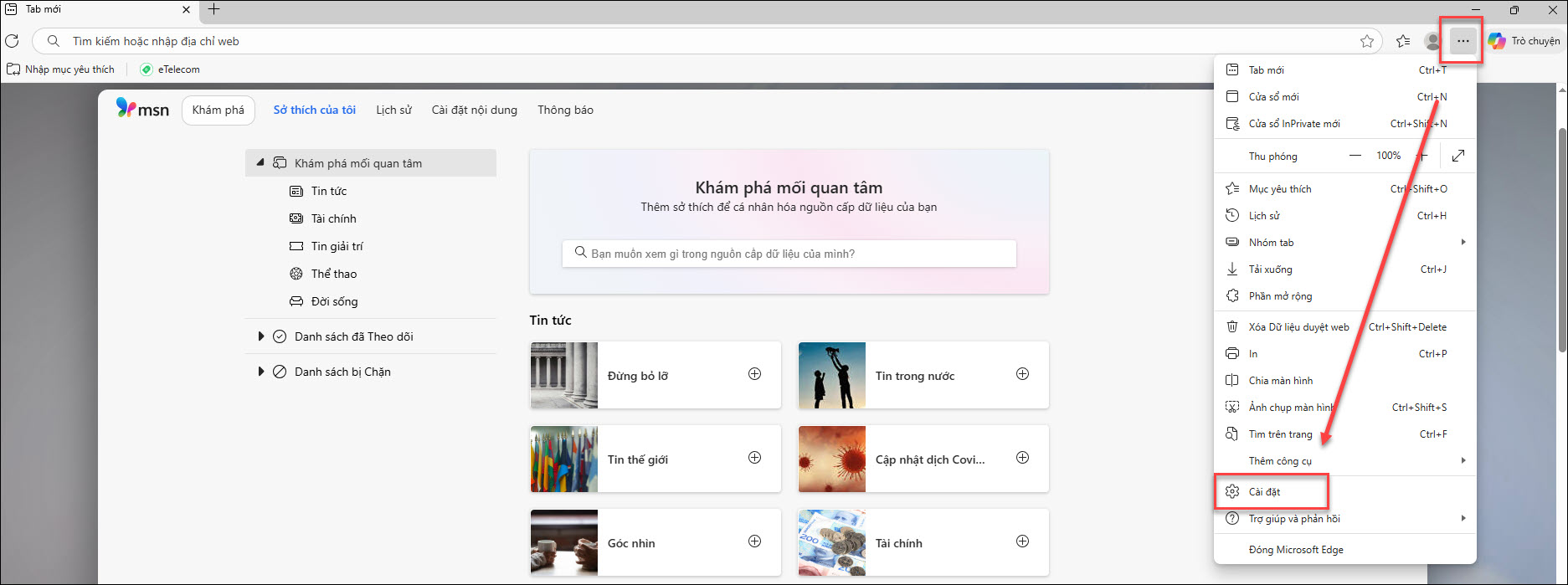 Bước 2: Nhấn vào biểu tượng ba dấu chấm (⋯) ở góc trên bên phải, chọn Cài đặt (Settings).