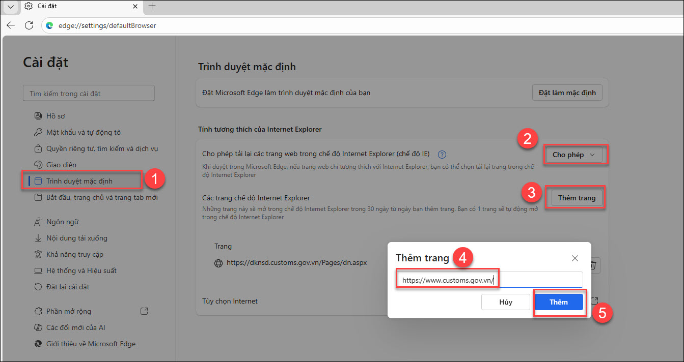 - Nhấn Thêm trang, thêm lần lượt 2 trang đăng ký hải quan : https://www.customs.gov.vn/ và https://dknsd.customs.gov.vn/Pages/dn.aspx