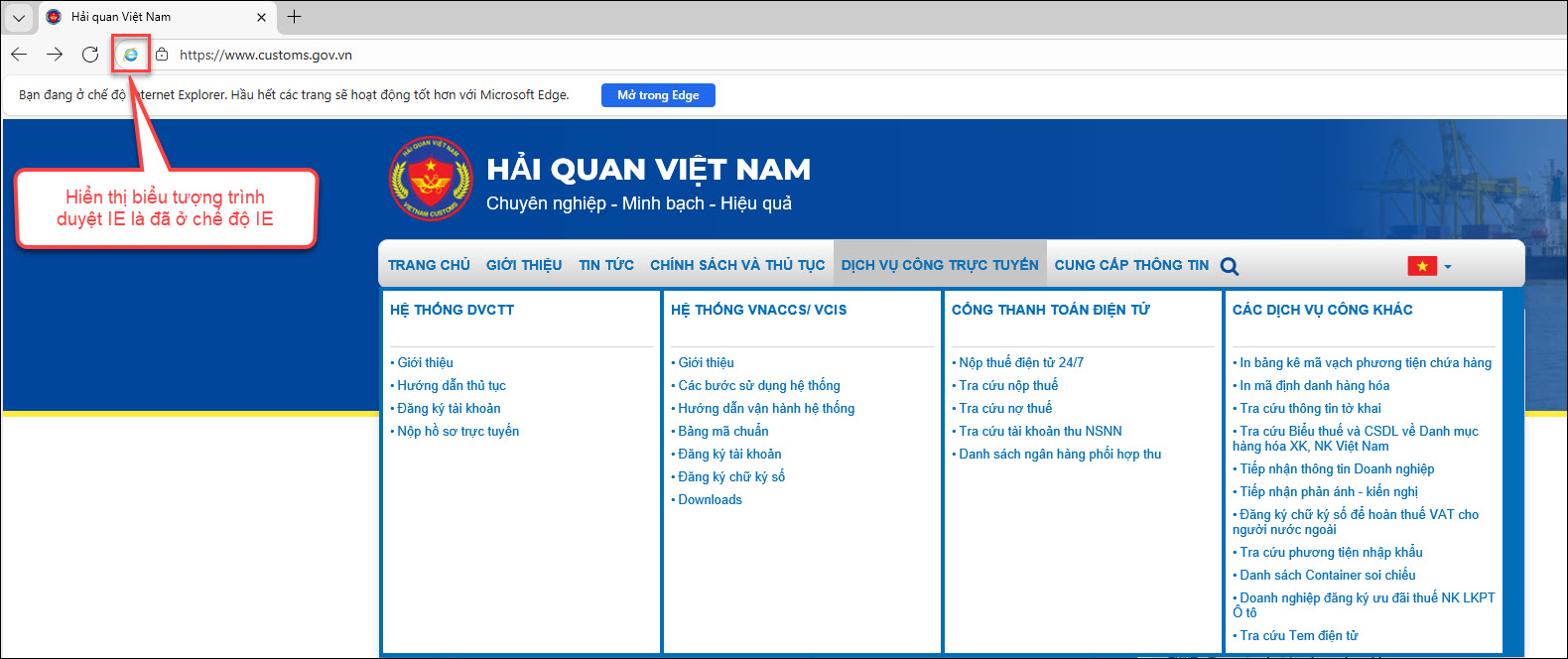 Truy cập trang đăng ký hải quan bằng trình duyệt Edge, trang web sẽ hiển thị chế độ IE