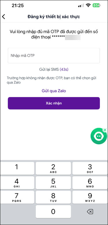 Người dùng thực hiện lấy mã OTP theo 2 hình thức SMS và Zalo