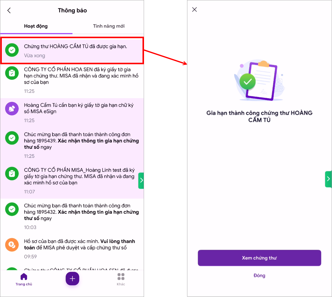 Sau khi hồ sơ gia hạn CTS được phê duyệt, ứng dụng MISA eSign sẽ có thông báo ở quả chuông. Anh/Chị đã có thể bắt đầu sử dụng CTS ngay từ bây giờ.