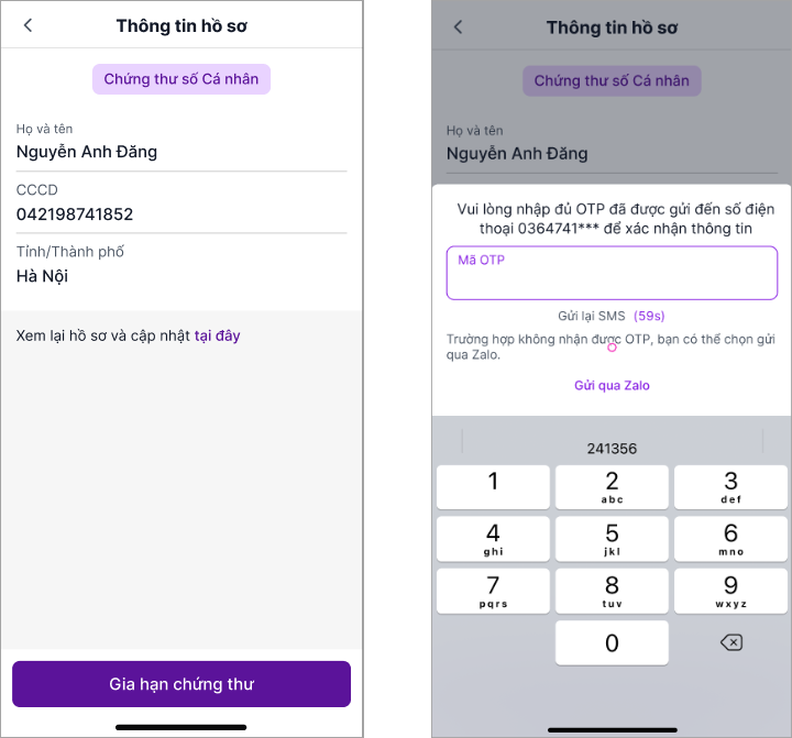 Nhấn vào biểu tượng quả chuông ở góc bên phải, sau đó nhấn vào thông báo “Xác nhận thông tin gia hạn chứng thư số ngay”.