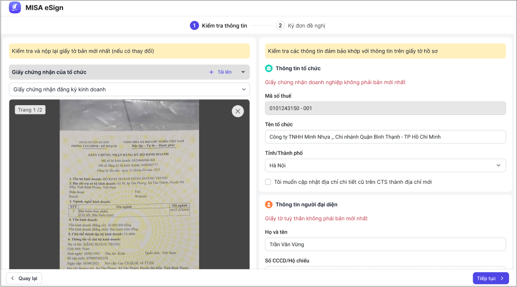 - Tải lại ảnh bản gốc mới nhất của Giấy ĐKKD và CCCD/Hộ chiếu còn hiệu lực của Người đại diện (nếu có cảnh báo cần cập nhật)