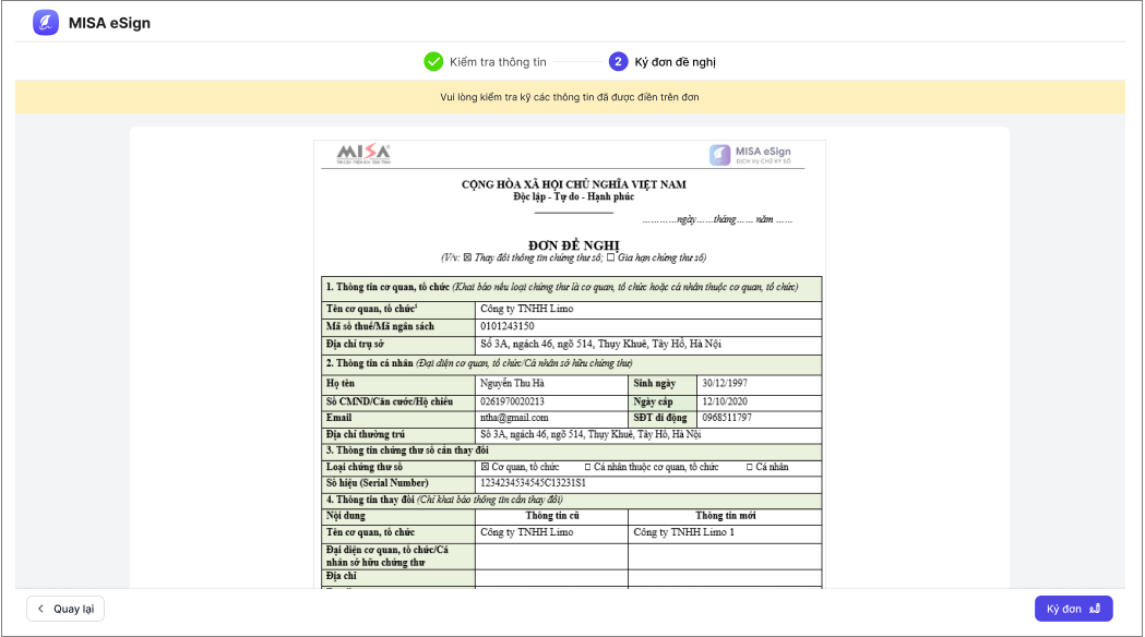- Hệ thống sẽ lấy lên các thông tin và tự động điền sẵn và đơn đề nghị. Anh/chị vui lòng kiểm tra kỹ các thông tin trên đơn vì đây là các thông tin sử dụng để cấp CTS.