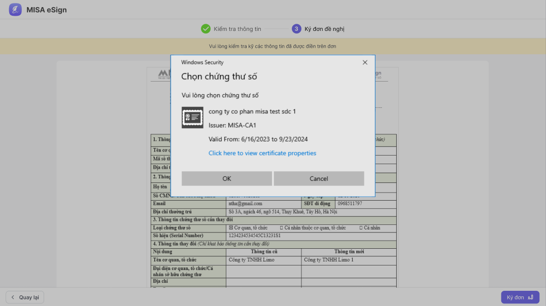 - Vui lòng chọn chứng thư số để ký vào đơn.