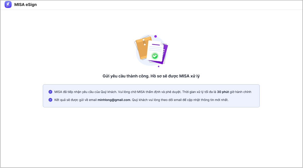 - Hồ sơ sẽ được gửi về MISA ngay sau khi Đơn đề nghị được ký thành công