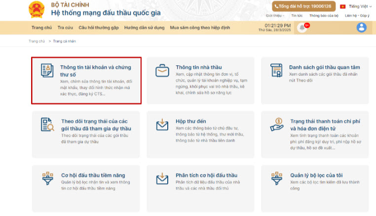 Để cài đặt CTS công cộng sử dụng trên hệ thống mạng đấu thầu quốc gia mới, người dùng cần đăng nhập tài khoản của mình vào hệ thống mới và cắm USB Token đã được đơn vị cung cấp dịch vụ CTS công công cung cấp trước khi thực hiện theo các bước sau đây: