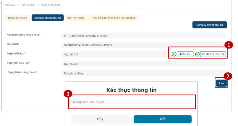 Sau khi Lưu chứng thư số thành công. Hệ thống hiển thị form yêu cầu người sử dụng nhập mã xác thực: