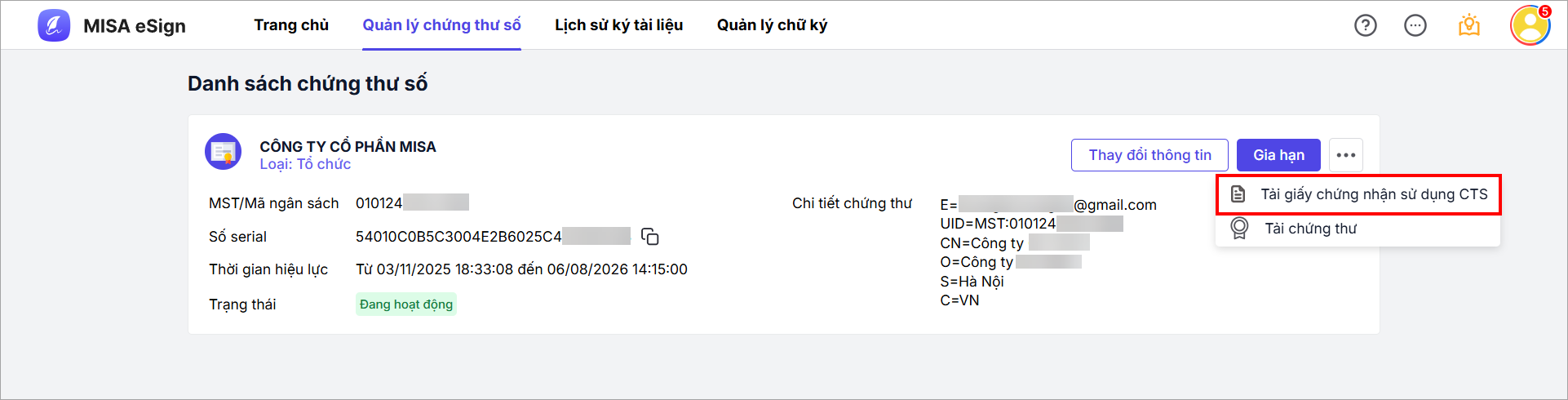 - Nhấn chọn Biểu tượng 3 chấm > Chọn Tải giấy chứng nhận sử dụng CTS