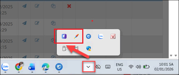 - Kiểm tra đảm bảo máy tính đã cài chữ ký số và bộ cài phần mềm hỗ trợ ký số của trang: Nhấn vào mũi tên góc bên phải màn hình kiểm tra xem đã hiển thị biểu tượng chữ ký số Esign và hình cây bút của phần mềm hỗ trợ ký số
