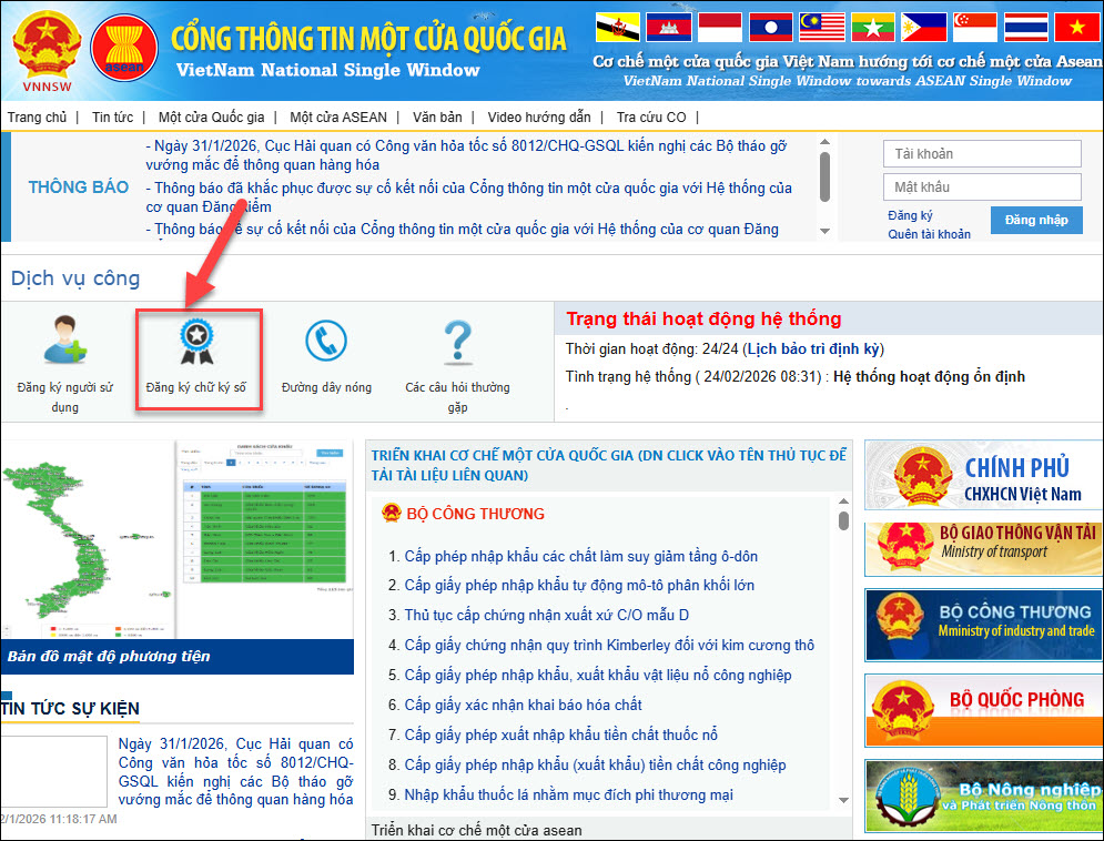 Bước 1. Sau khi đăng ký thành công chữ ký số trên trang http://customs.gov.vn người dùng truy cập lại trang https://vnsw.gov.vn