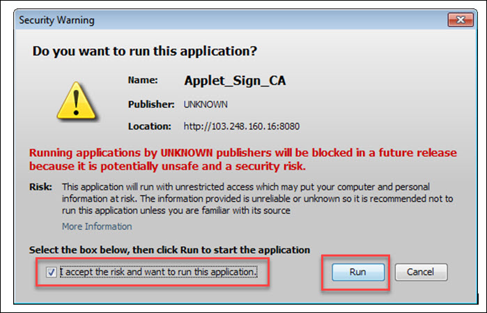 Bước 2: Nhấn vào nút Sửa Bước 3: Hiển thị cảnh báo Security Warning, chọn checkbox I accept the risk and want to run this application, nhấn Run để chạy ứng dụng