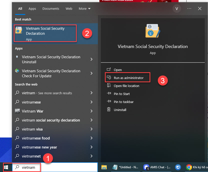 Vào start, chọn Vietnam Social Security Declaration để mở ứng dụng nền