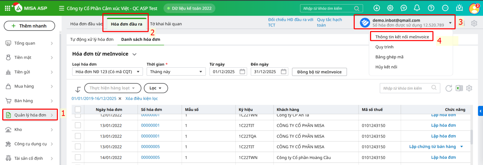Bước 1: Vào Quản lý hóa đơn/ Hóa đơn đầu ra/ bấm vào mail kết nối meinvoice/ Thông tin kết nối meinvoice