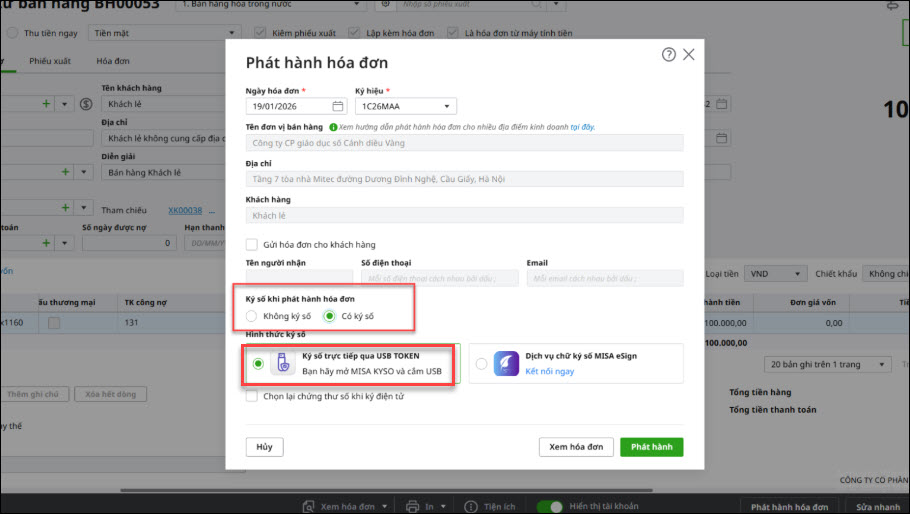 • Trên giao diện phát hành hóa đơn/ Ký số khi phát hành hóa đơn/ Có ký số (đối với hóa đơn máy tính tiền), tích chọn Ký số trực tiếp qua USB TOKEN