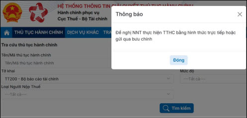 Ký nộp BCTC báo lỗi Đề nghị NNT thực hiện TTHC bằng hình thức trực tiếp hoặc gửi qua bưu chính