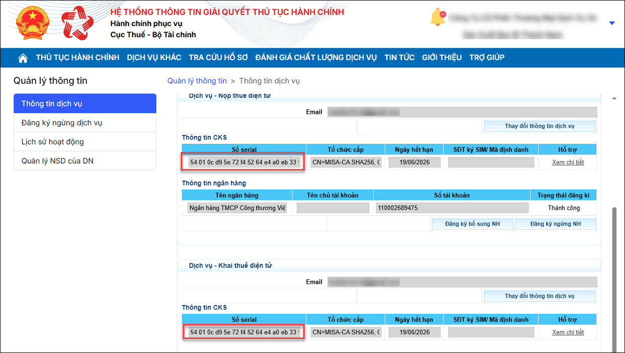 Kiểm tra thông tin số serial ở phần Dịch vụ – Nộp thuế điện tử và Dịch vụ – Khai thuế, đối chiếu với số serial chữ ký số ở bước 1, nếu khác nhau làm thay đổi chữ ký số theo hướng dẫn tại đây.