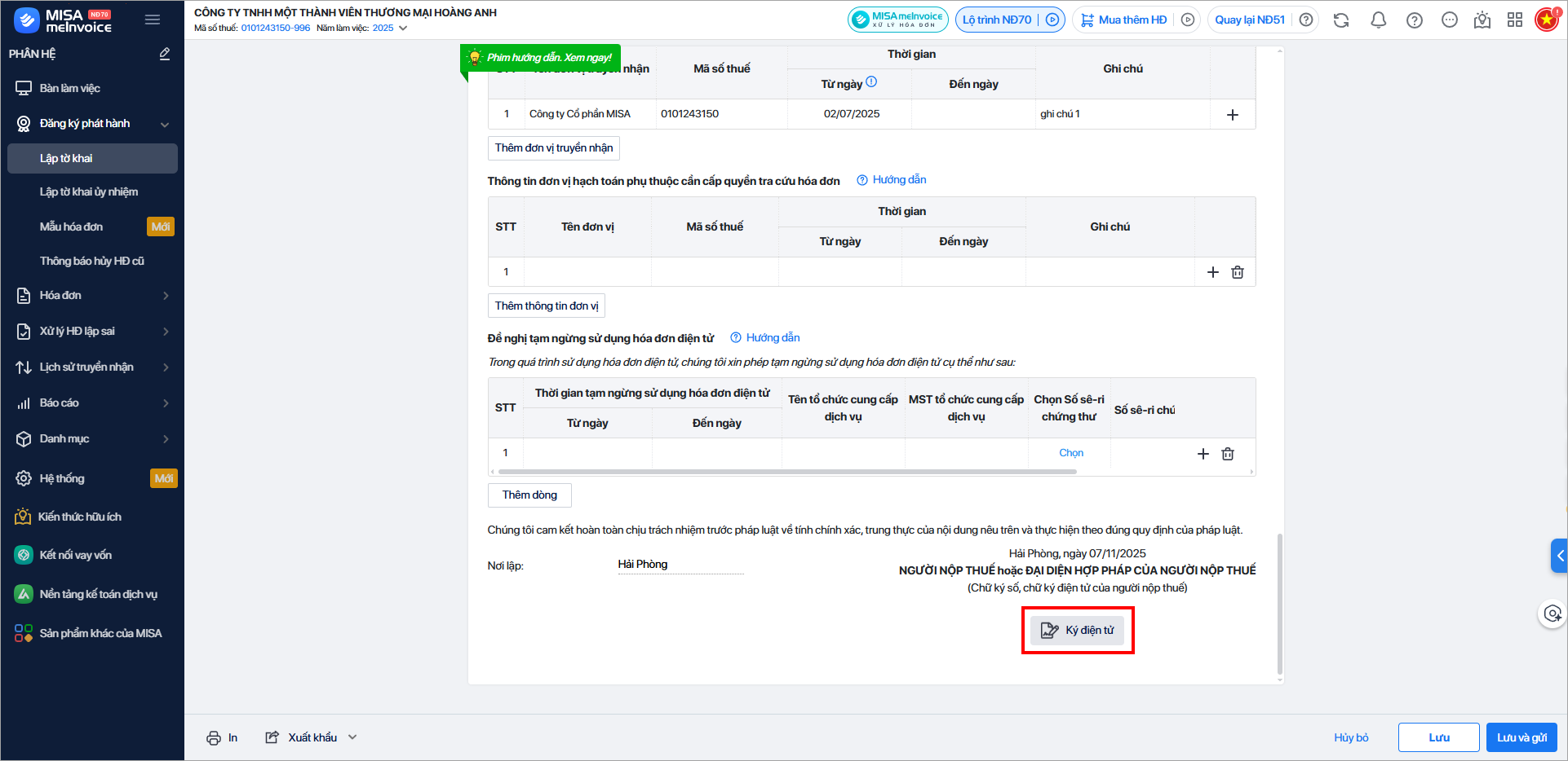 Sau khi ký xong, anh/chị nhấn Lưu và gửi. Tờ khai sẽ được gửi lên Cơ Quan Thuế và chờ phê duyệt.