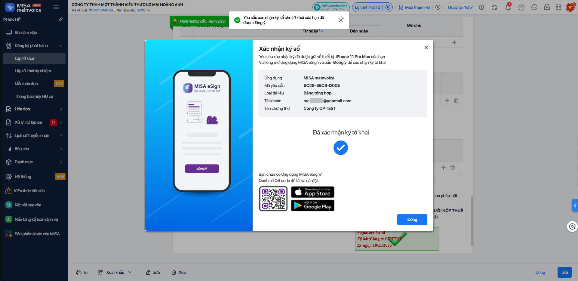 Bước 2: Ký tờ khai, hóa đơn điện tử bằng chữ ký số từ xa MISA eSign trên MISA meInvoice