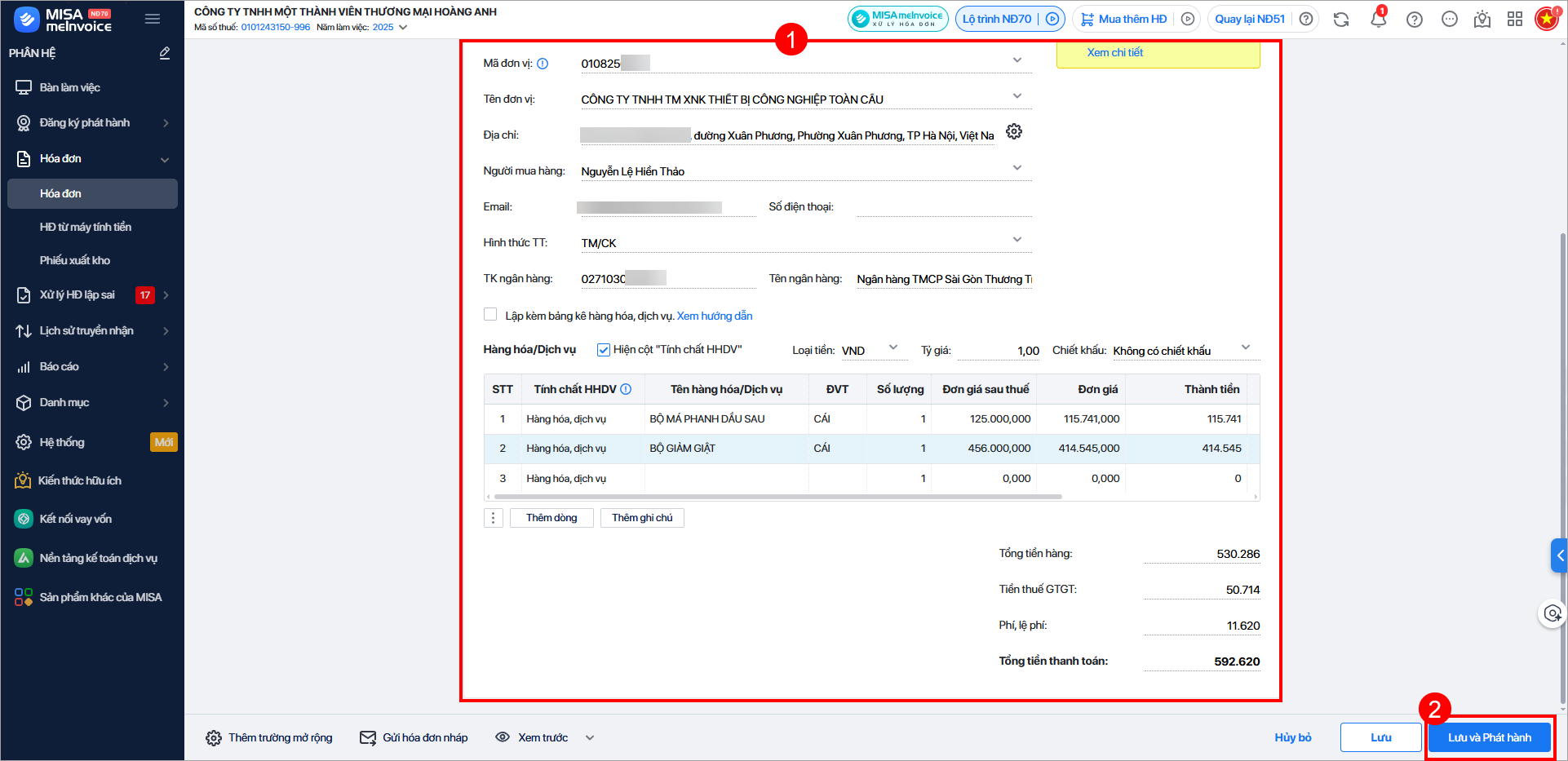 - (2) Sau khi hoàn thiện việc khai báo hóa đơn, nhấn Lưu và Phát hành.