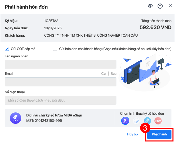 - (3) Nhấn Phát hành để thực hiện phát hành hóa đơn điện tử.