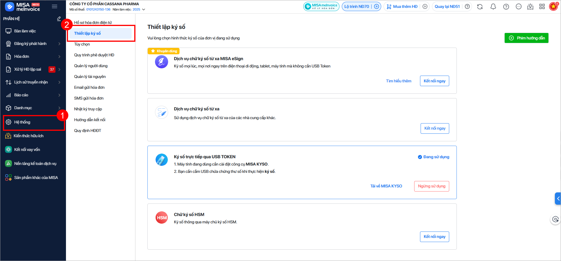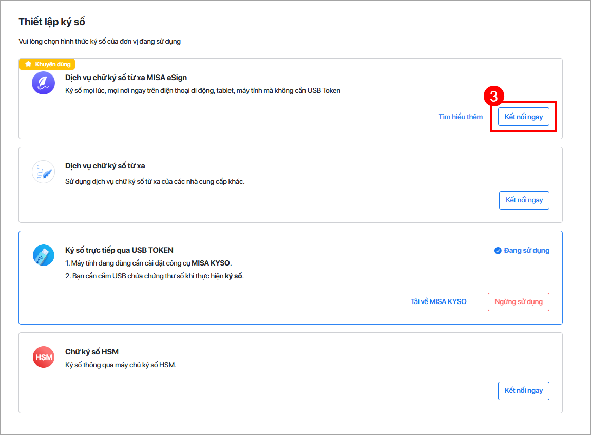 - Chọn Chữ ký số từ xa MISA eSign, Nhấn Kết nối ngay (3)