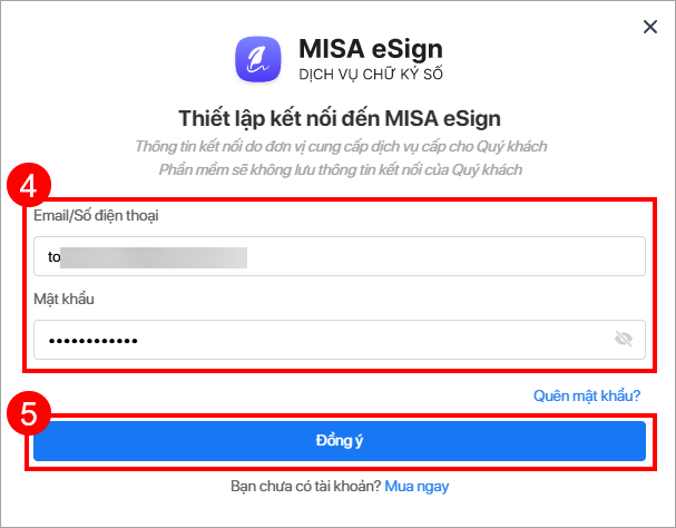 - (4) Đăng nhập tài khoản MISA eSign (Thông tin tài khoản sẽ được cung cấp khi khách hàng đặt mua CKS thành công)