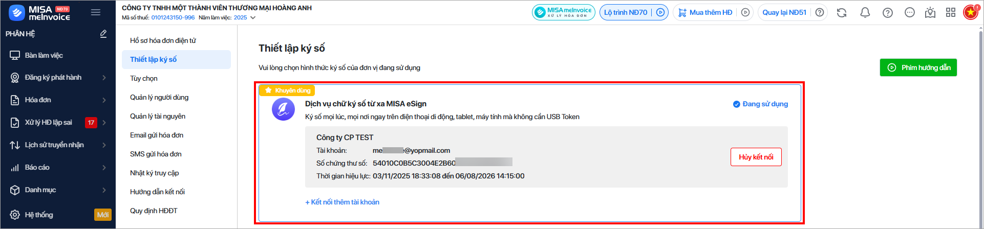 Như vậy, anh/chị đã thực hiện kết nối chữ ký số từ xa MISA eSign thành công.