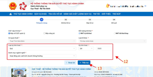 - Thực hiện kiểm tra lại các thông tin Loại kỳ tính thế, Kỳ tính thuế, Danh mục ngành nghề rồi nhấn Tiếp tục