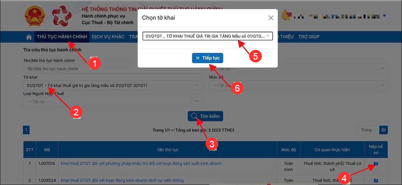 - Nhấn biểu tượng cột Nộp hồ sơ, chọn tờ khai rồi nhấn Tiếp tục