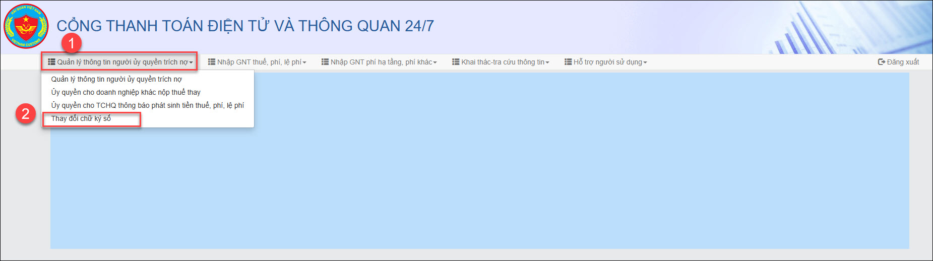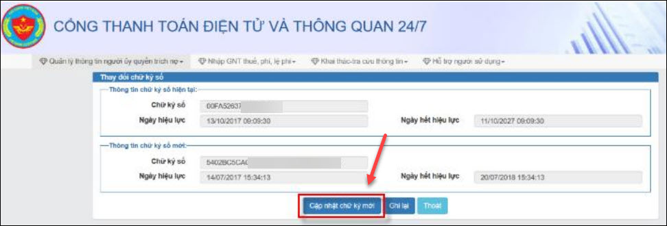 4. Thay đổi chữ ký số trên trang Cổng thanh toán điện tử và thông quan 24/7 (epayment.customs.gov.vn)