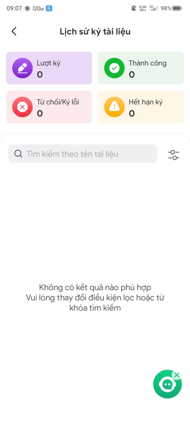 Mục đích: Hướng dẫn Anh/chị cách xem lại lịch sử ký tài liệu (thành công, từ chối, lỗi, hết hạn) trên ứng dụng MISA eSign mobile.