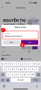 - (3) Chọn kiểu nhãn chữ ký: Vẽ (ký trực tiếp lên ứng dụng)/Tên chứng tư (Lấy theo tên chứng thư)/ Ảnh (Tải lên từ kho ảnh trên thiết bị di động)