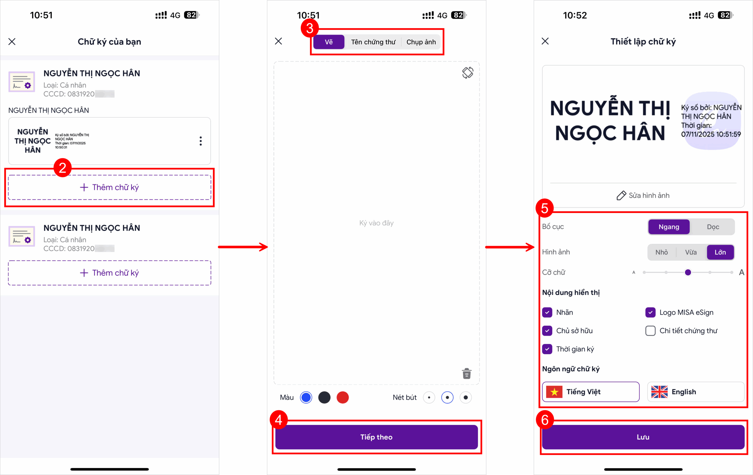 - (3) Chọn kiểu nhãn chữ ký: Vẽ (ký trực tiếp lên ứng dụng)/Tên chứng tư (Lấy theo tên chứng thư)/ Ảnh (Tải lên từ kho ảnh trên thiết bị di động)